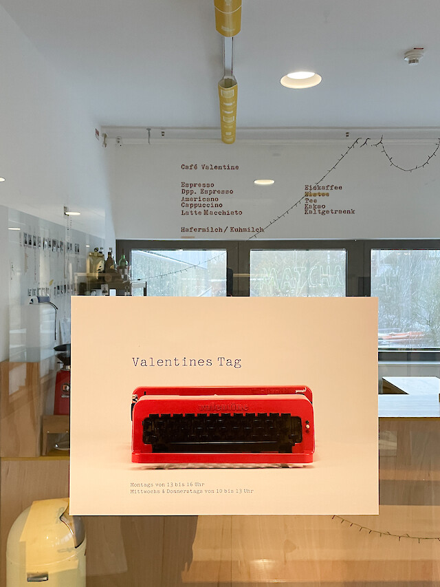 CAFÉ VALENTINE / SECOND FLOOR What the professors say about the course of study is one thing – here you have the chance to hear first hand from students of the course what they have to say about it! come and talk to us over coffee and snacks. Was die Lehrenden über den Studiengang sagen, ist die eine Sache. Eine ganz andere Sache sind die Erfahrungsberichte der Studierenden. Im Café Valentine erwarten euch vielleicht eure zukünftigen KommilitonInnen neben euch und plaudern aus dem Nähkästchen. Kommt und quatscht mit uns!16:00 - 18:00