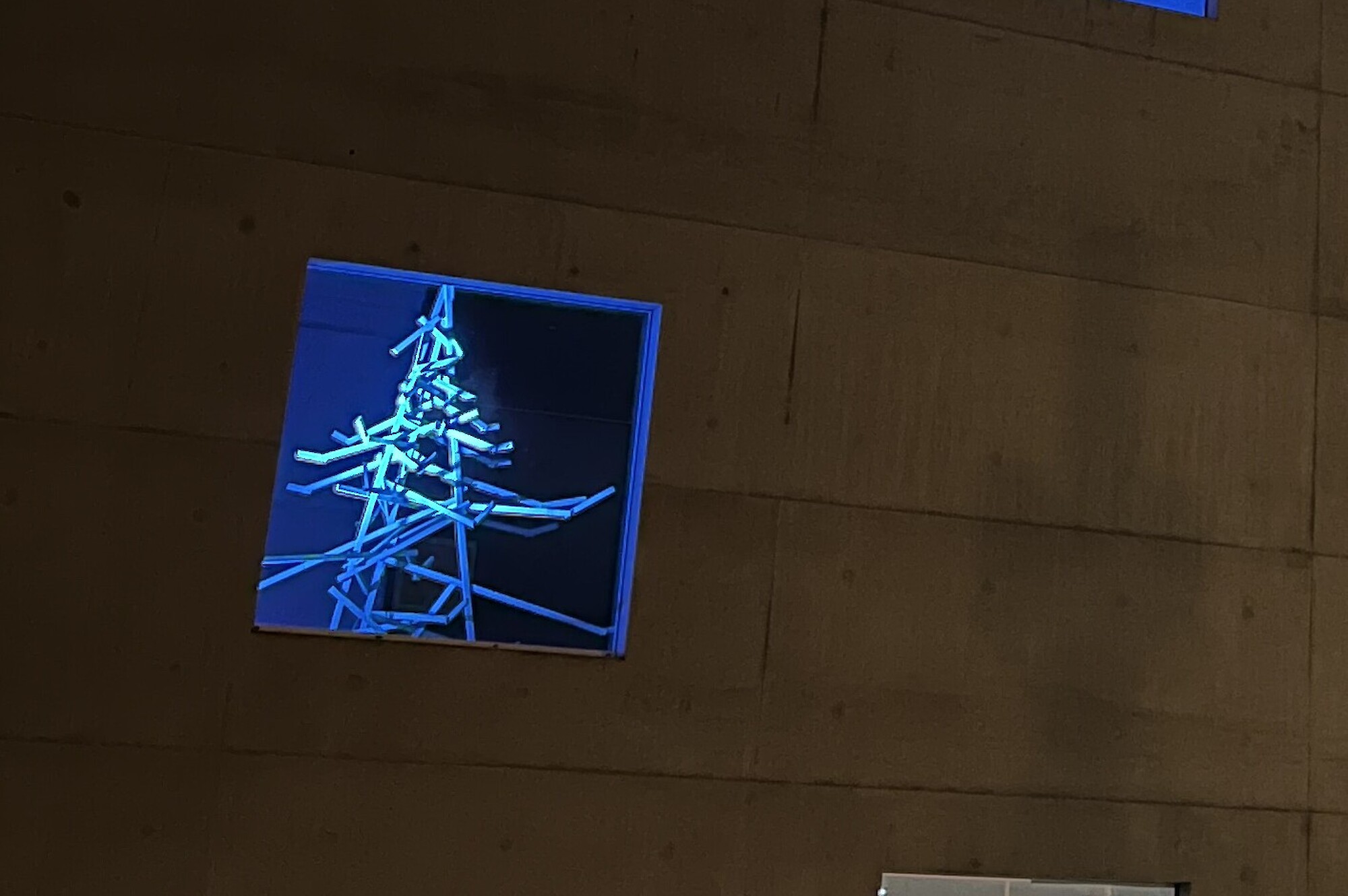 Material: Imprägnierte Dachlatten, LED-Strahler, Laserprojektor